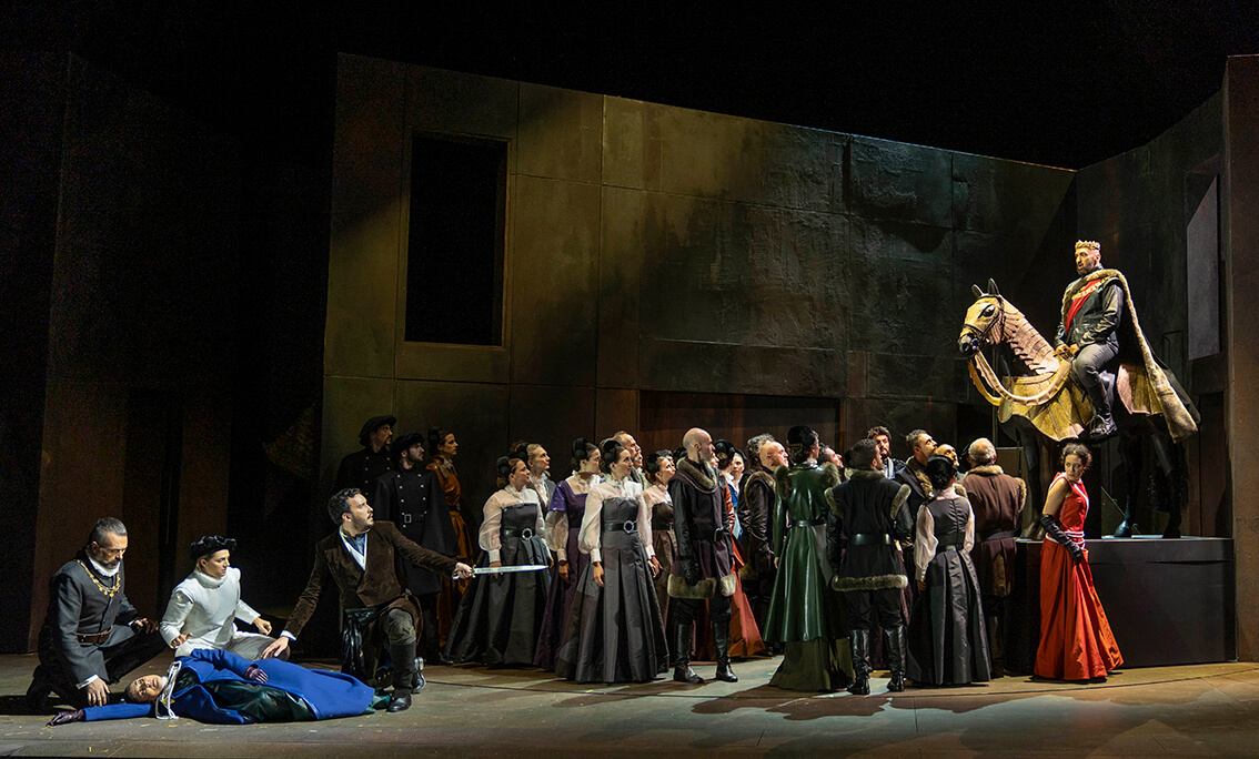 Los espacios son oscuros e inquietantes: puertas y mamparas de 10 metros de altura dan claramente la idea de que los hechos que allí suceden son terribles y que los personajes que los recorren no pueden sentirse seguros. Por su parte, de manera deliberada, los vestuarios de Margherita Baldoni no pertenecen a un período histórico concreto. Algunas reminiscencias al periodo Tudor —sobre todo en los vestuarios masculinos—, junto con evidentes propuestas modernas —en particular los femeninos—, crean una armonía con la cuidada iluminación de Alessandro Verazzi. Momentos claves —obviamente además del mítico final— son los cuadros vivientes con escenas de Jesús en la cruz o el famoso retrato de Isabel I de niña completan la victoriosa producción.