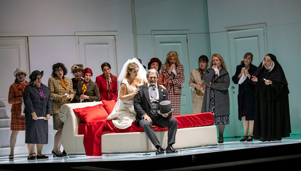 La dirección musical de Leonardo Sini fue uno de los grandes aciertos de la noche. El maestro se ganó el primer aplauso apenas terminó la obertura, conducida con energía y precisión. Después vino una lectura muy clara —la partitura no es especialmente compleja en lo cromático, pero sí en lo rítmico— y siempre atenta a las necesidades de los cantantes, su desplazamiento escénico y los constantes cambios de tempo. Sini consiguió una coordinación impecable entre foso y escenario, acompañó con finura las múltiples romanzas de la ópera y sostuvo con firmeza las intervenciones del coro dirigido por Denis Segond. Sobre todo, transmitió ese entusiasmo luminoso, tan mediterráneo, que caracteriza la música de Rota.
