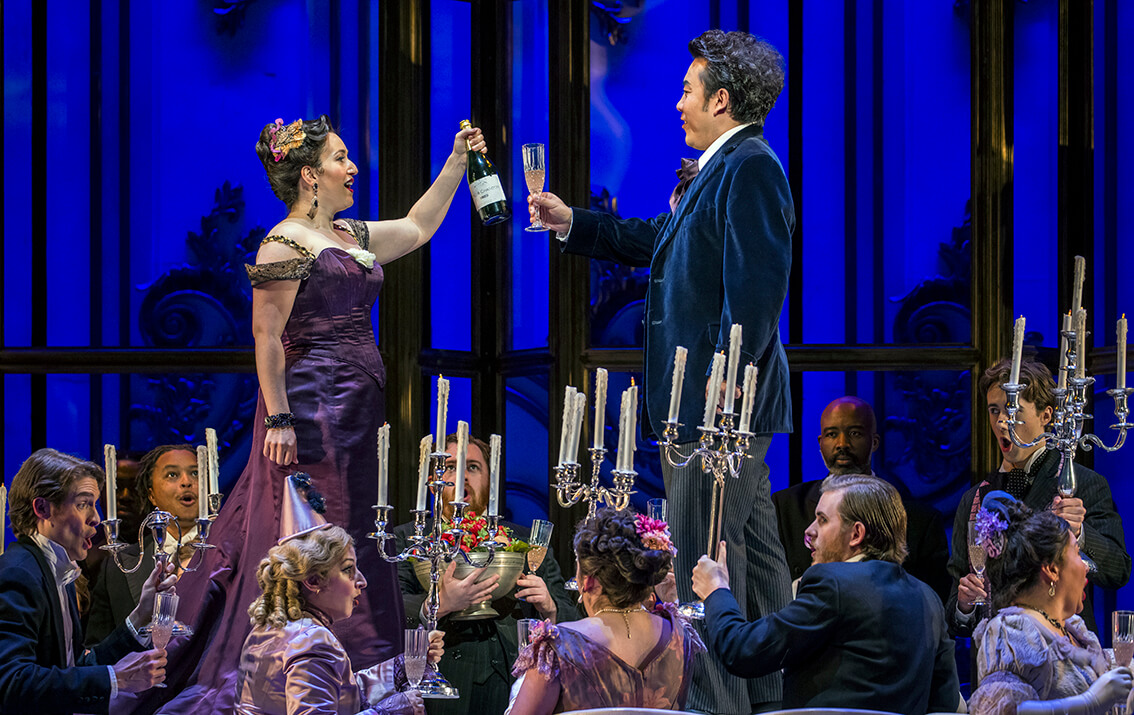 Mané Galoyan (Violetta) y Long Long (Alfredo) encabezan el brindis en La traviata de Giuseppe Verdi en la Ópera de Atlanta © Raftermen