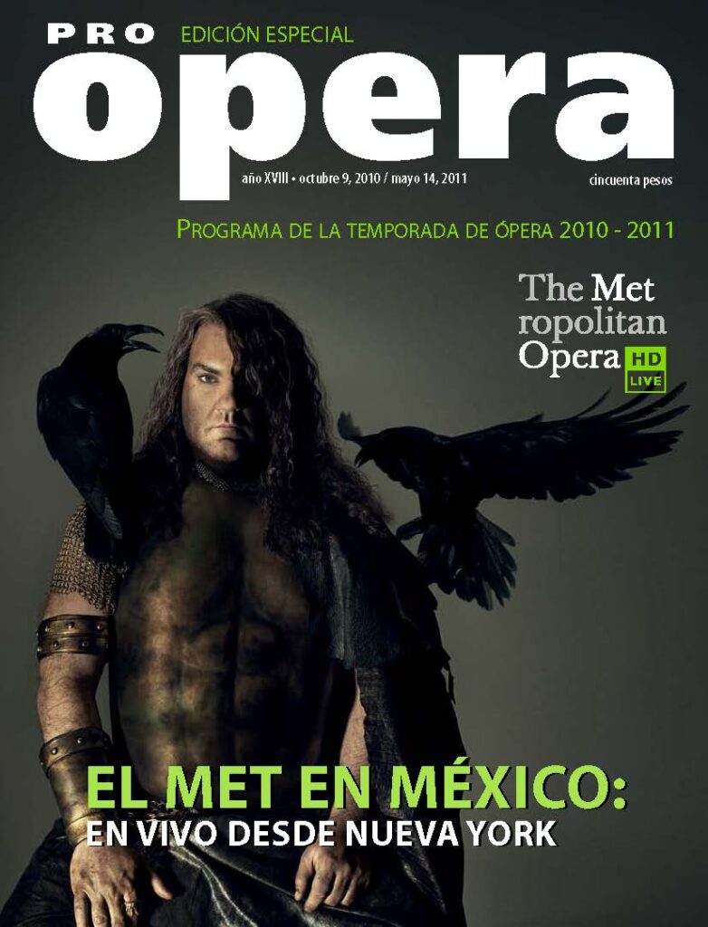 Programa de la temporada 2010-2011 de las transmisiones del Met en vivo desde Nueva York. En la imagen, Bryn Terfel como Wotan en Das Rheingold de Richard Wagner