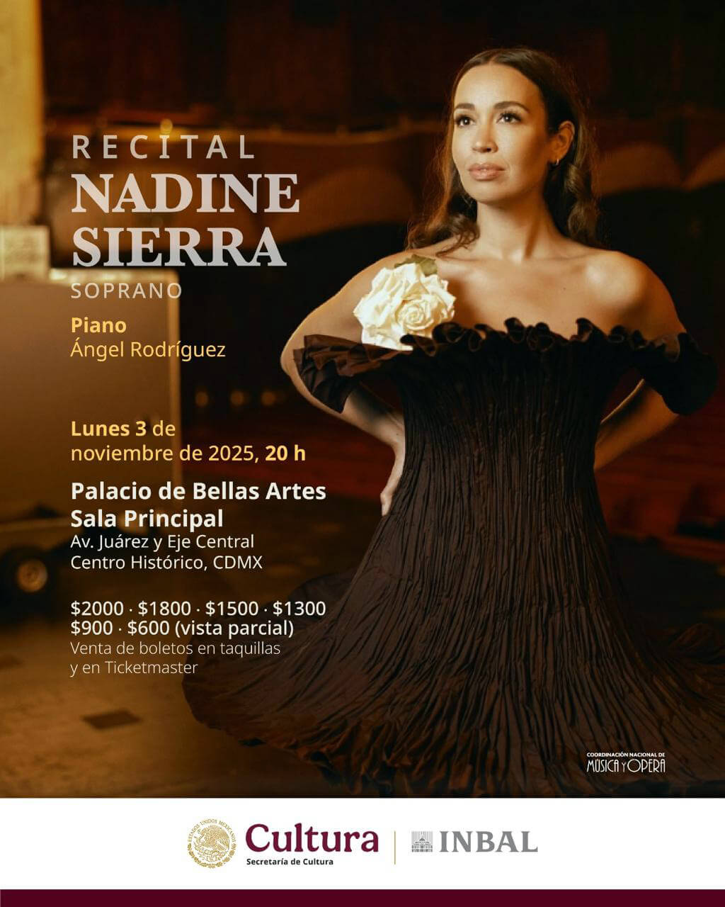 La soprano estadounidense Nadine Sierra se ofrecerá un recital el próximo lunes 3 de noviembre, a las 20:00 horas, en la Sala Principal del Palacio de Bellas Artes, acompañada del pianista Ángel Rodríguez, en un programa musical que incluirá arias de ópera de Mozart, Verdi, Gounod, Puccini, Donizetti y Bellini, así como obras de compositores como Gershwin, Ponce y Villa-Lobos.