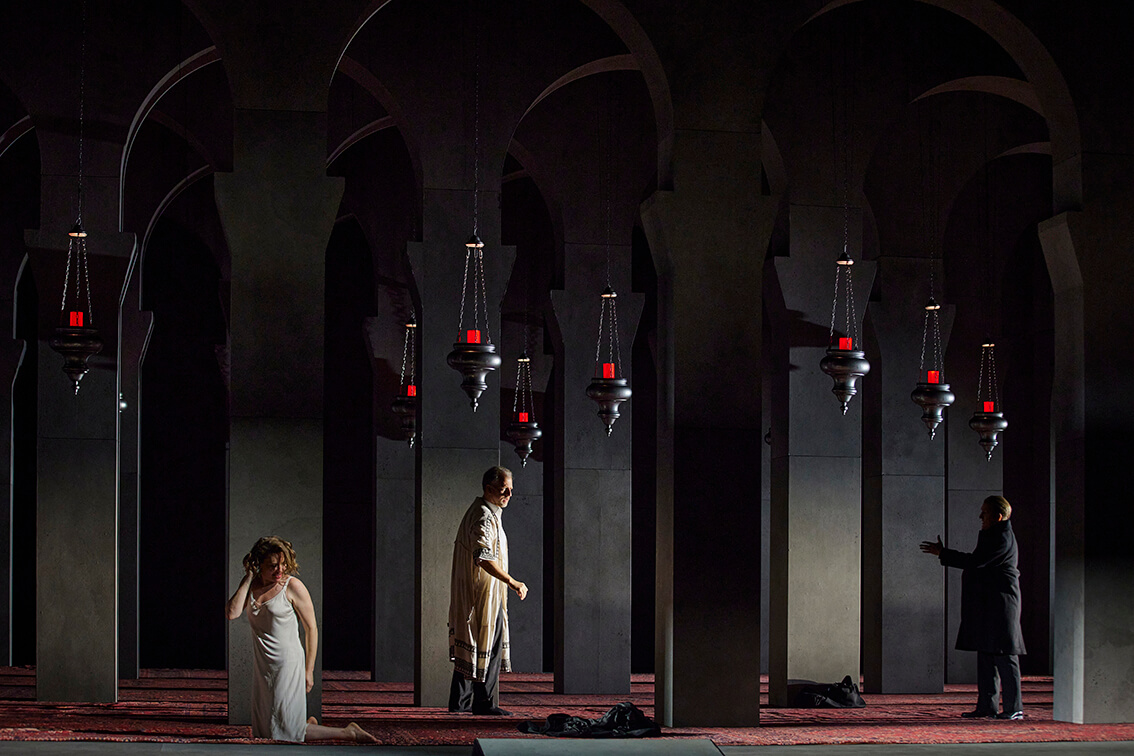 La escenografía de Carsten, influenciada por la combinación de colores negruzcos de Francisco Goya, complementa la pintura orquestal de Glanert. Los terrenos y habitaciones frías y oscuras contrastan con linternas rojas y amarillas en varios escenarios. La coreografía, dirigida por Marco Berriel, transformó al coro del Semper Oper (magníficamente dirigido por Jonathan Becker) en diferentes personajes a lo largo de la función: árabes, judíos y cristianos que rezan pacíficamente; un rígido grupo de funcionarios de la corte; una turba saqueadora; y un ejército sediento de sangre.