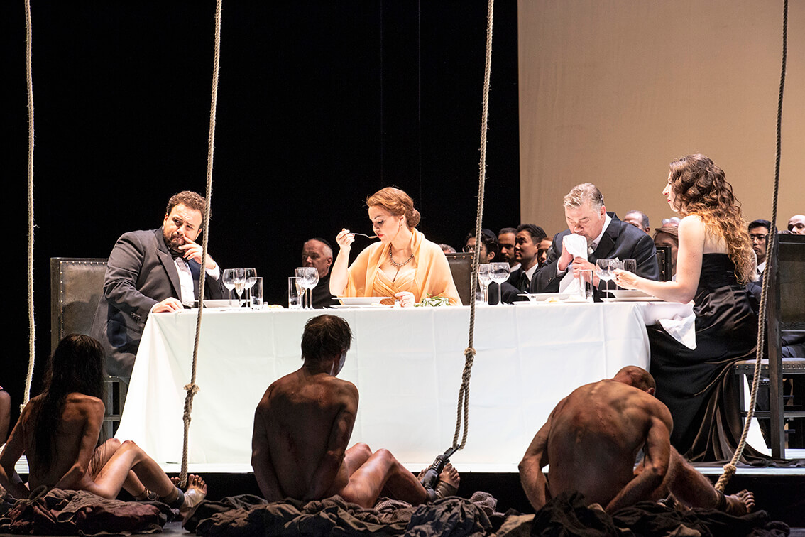 Pero la función comenzó con los monjes cantando por detrás de una gran mesa elevada donde Filippo, Elisabetta, Eboli y Don Carlo están sentados disfrutando una cena.