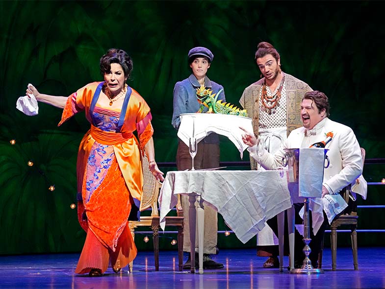 En la puesta en escena de Florencia… sorprende el gusto refinado por los decorados y una sobriedad que, sin embargo, alude perfectamente al realismo mágico que impera en el libreto escrito por Marcela Fuentes-Beráin. Con recursos que bien pudieran realizarse ya hace muchos años, a excepción de la multimedia, la puesta en escena de Mary Zimmerman es mágica. Una propuesta sobria, sin excesos y aun así elocuente, que permite centrar la atención en los personajes y su desarrollo a lo largo de los dos actos que componen la ópera. Un bote sugerido por apenas unos cuantos elementos que se movían de posición, pues lo que importa aquí es el viaje; un río azul profundo flanqueado por una selva amazónica de verde vivo por el que navegamos junto a los personajes; los exóticos animales del Amazonas, marionetas manejadas por los mismos marineros; elementos de la naturaleza como el agua, representados por maravillosos vestidos azules con los cuales los bailarines evocan la trágica tormenta que hunde el bote al final del primer acto.