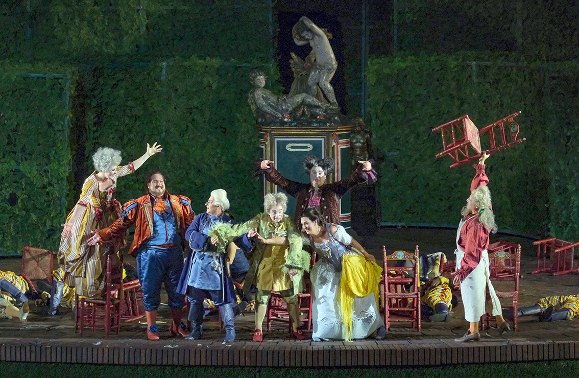 Flores gigantes abarrotan el escenario donde un laberinto de setos se mueve durante el espectáculo para delimitar los espacios y dar vida a situaciones muy cercanas a los dibujos animados. También en esta ocasión, los colores, la vivacidad y las coreografías al estilo español de Leda Lojodice conquistaron al público que acogió calurosamente la producción de esta ópera bufa de Gioachino Rossini.