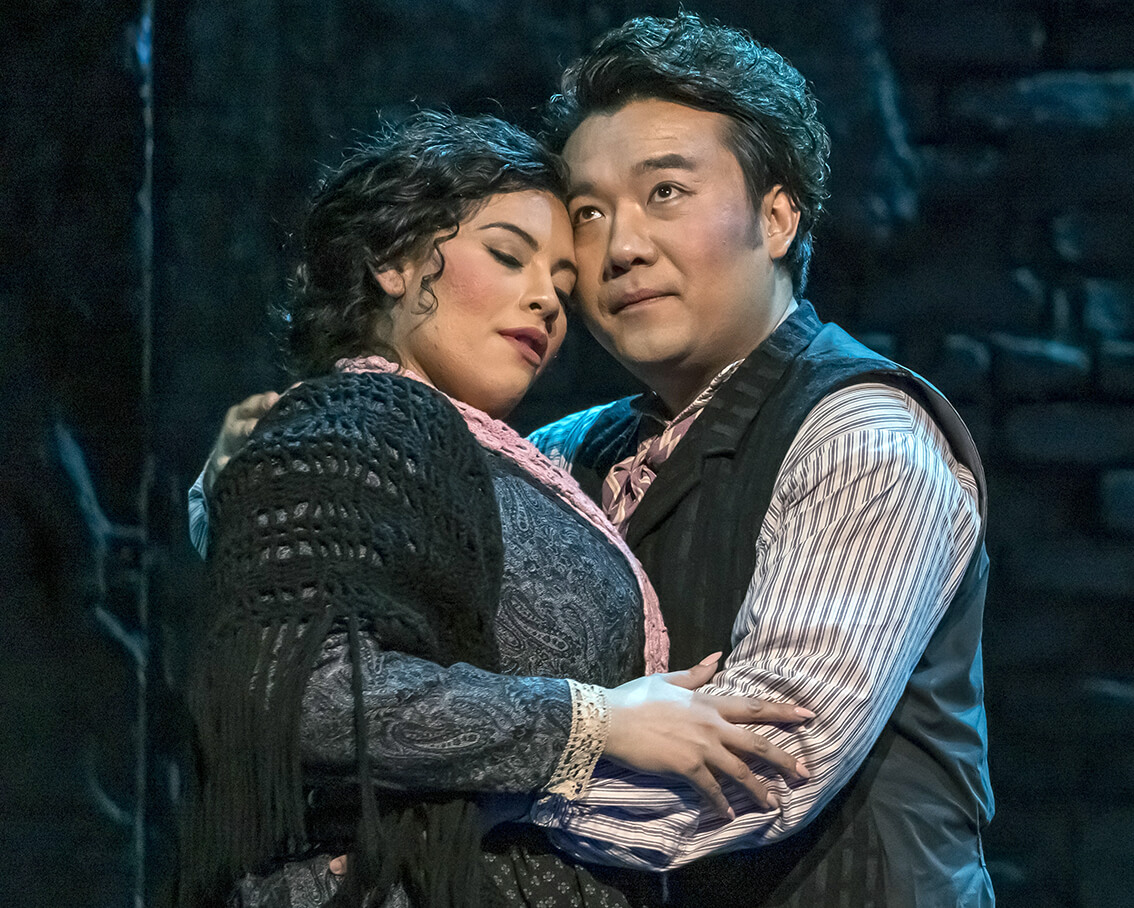 Tuvimos un extraño fenómeno en la pareja principal. Se trató de dos voces muy parejas, con la misma técnica y excelente interpretación, donde se notó una gran química y naturalidad que es poco común en el mundo de la ópera. El tenor chino Long Long, de timbre lírico-spinto, se desenvolvió con gran naturalidad por todo el escenario, con una técnica muy definida y hermoso agudo, hecho que compartió con la soprano nicaragüense Gabriella Reyes, que pareciera hubieran sido alumnos del mismo plantel, lo que no es cierto. Esta soprano promete un mundo entero, una voz fuerte capaz de producir pianissimi sin ninguna dificultad y permitiéndose sonidos desgarradores, alejándose un poco de la técnica vocal para producir el sonido deseado.