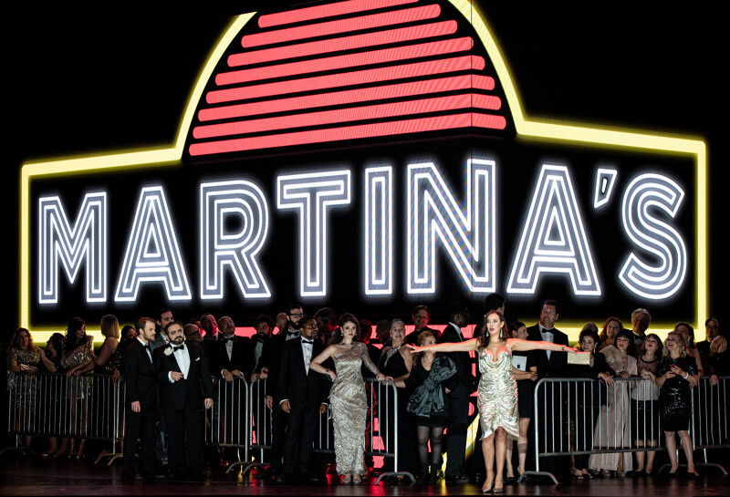 El marco escénico creado por Robert Cousins utiliza el escenario giratorio con dos grandes paredes perpendiculares que dejan ver un exterior y un interior. En el lado exterior, donde prevalece el negro, las paredes son enormes pantallas en las que se difunden videos, publicaciones de Instagram, conversaciones por SMS, correos electrónicos del banco o resultados de análisis médicos, entre fotografías de bellos momentos de vida de pareja entre Violetta y Alfredo. Esto da soporte a la trama, pero en algunos momentos distrae de la música y el canto.