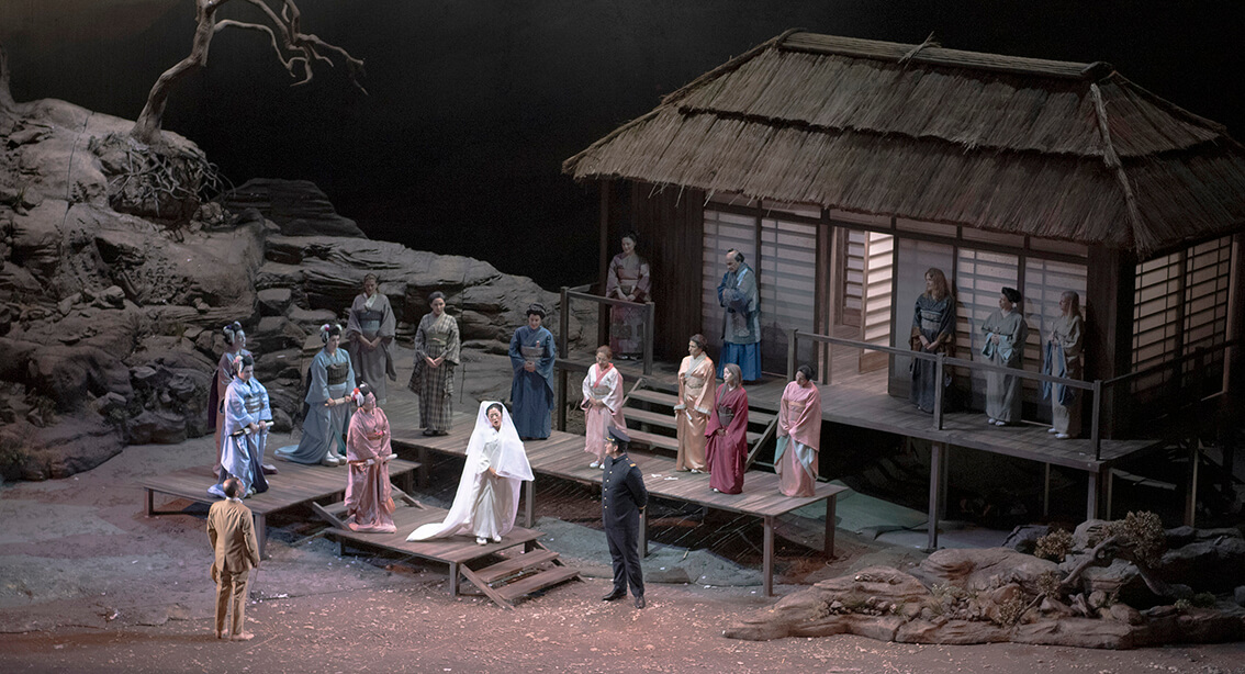 Para ello contó con extraordinario boceto escenográfico de Nicolás Boni quien, con tonos ocres, un lugar yermo sin ninguna cualidad noble, alegre o primaveral y una pequeña casa de campo japonesa de factura humilde y techos de paja (minka) ambientó la escena. La casa se encuentra en el costado derecho del escenario (según ve el espectador), por detrás la colina y un árbol seco y con raíces a la vista y detrás colinas más altas. Por delante se delimitan tres espacios: a nivel del piso, una pasarela para llegar a la casa y una balconada de madera en el entorno de la casa. Casi no se utiliza el interior de la casa —que sería el cuarto espacio— salvo para la noche de la espera y no existe el jardín por lo cual no queda claro de dónde aparecen las flores en el final del segundo acto. En el comienzo del segundo acto la proyección de un alud que destruye parte de la casa y del entorno figurando la caída de la propia Cio-Cio San.