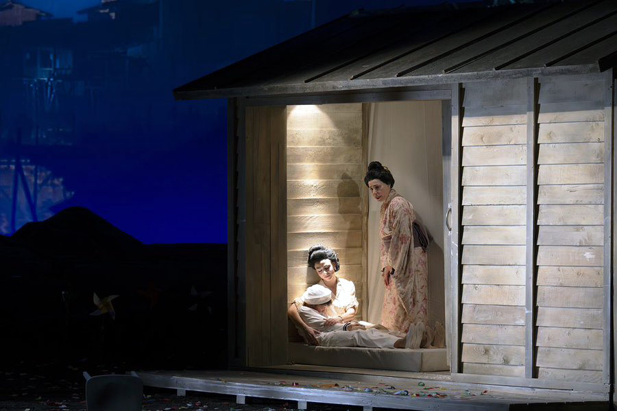 La puesta expone también algunas protestas de las geishas japonesas, quizás un guiño al actual clima bélico y político. La idea de la puesta es distinta, no exenta de cierta rigidez, pero que funciona con relación a la trama. El elenco de cantantes fue encabezado por la soprano Corinne Winters, una cantante de buenas cualidades vocales, con el brillo, la musicalidad, el despliegue fluido y fácil de agudos, y una adecuada proyección. La mezzosoprano Manuel Custer dio relevancia e intensidad al papel de Suzuki, por la suntuosidad de su timbre oscuro y nítido, como por la experiencia y dignidad que aportó al desarrollo de un personaje en ocasiones se sitúa en un segundo plano. En la idea de Benoin, Suzuki, muere en la misma escena que Cio-Cio San, con un brillante fondo rojo.