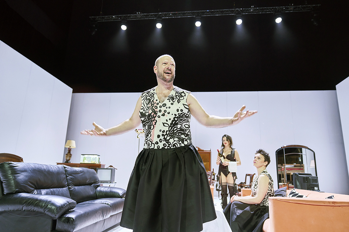 La puesta en escena de Calixto Bieito es adecuadamente claustrofóbica, y para su fama de enfant terrible, poco osada (que el hombre aparezca al principio y al final travestido y sintiéndose diferente no asusta a nadie, aunque él también termine por suicidarse). Los artistas prácticamente, aunque interactúan, están aislados, sobre todo la pareja casada.