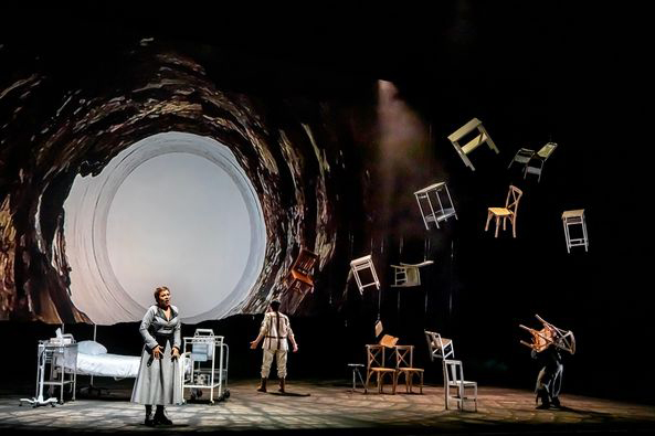 El diagnóstico de locura señalado desde el principio en voz del mago Zoroastro (aquí transformado en el director de un hospital psiquiátrico) trazó el tormentoso periplo introspectivo del protagonista en su universo demencial: solo una cama e instrumentos médicos, así como sillas y bancos ocuparon su lugar en el escenario, enmarcando las obsesivas pasiones que dominan el drama händeliano.