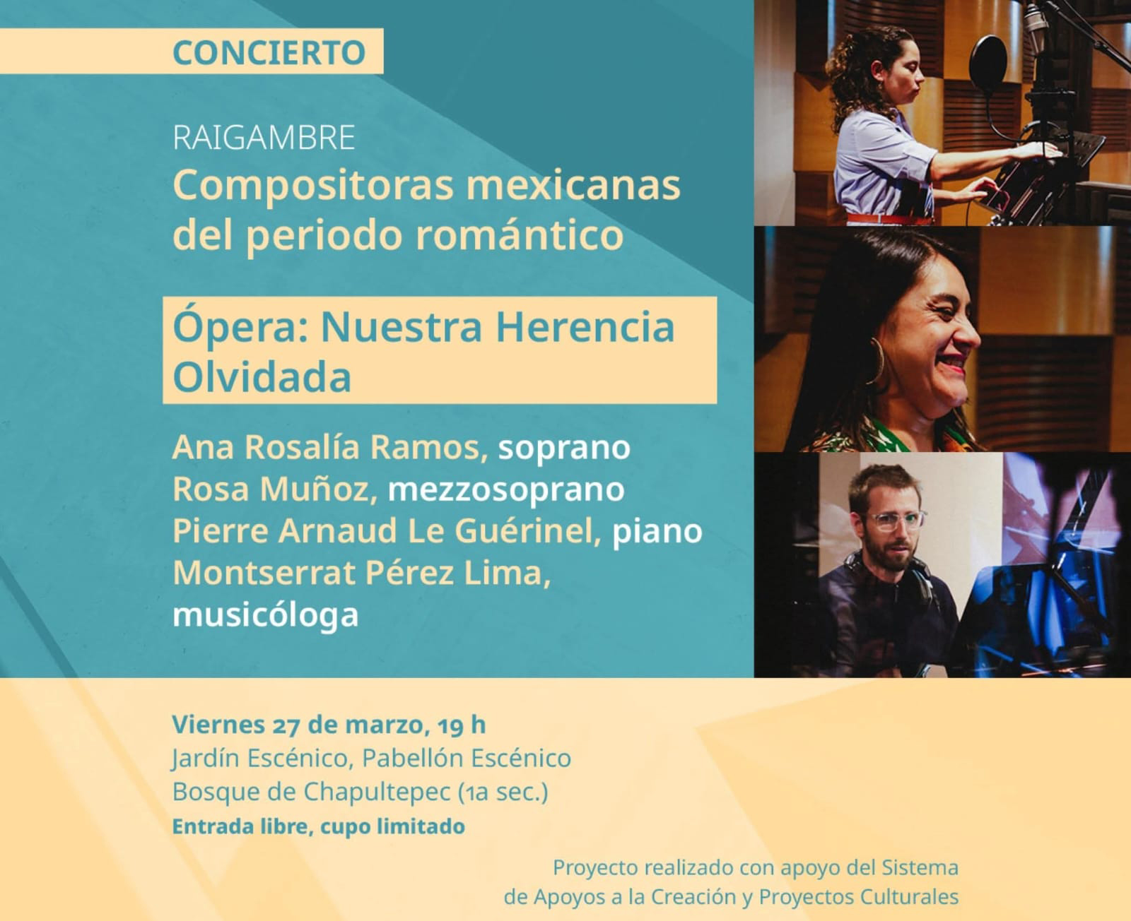 La compañía Ópera: Nuestra Herencia Olvidada, ofrecerá el concierto Raigambre. Compositoras mexicanas del periodo romántico, este viernes 27 de marzo a las 19 horas en el Jardín del Pabellón Escénico del Centro Cultural del Bosque, con entrada libre para el público en general.