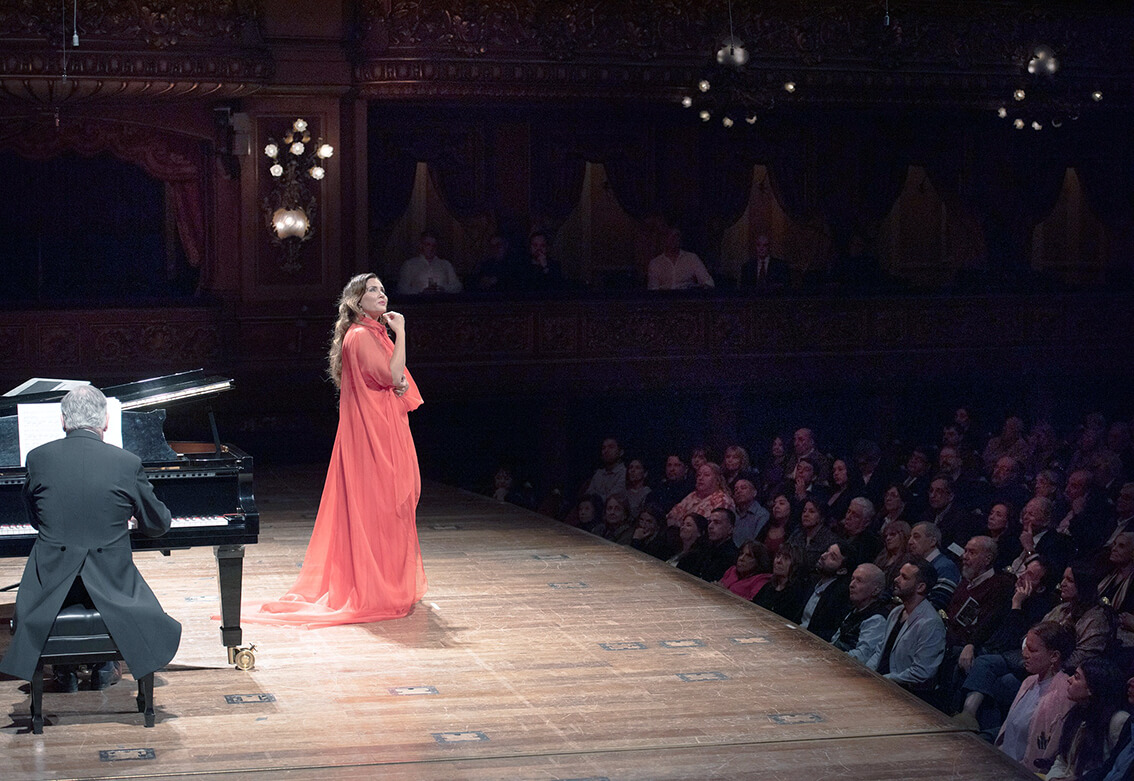 Las ovaciones del público determinaron tres fragmentos fuera de programa: ‘O mio babbino caro’ de Gianni Schicchi, de gran delicadeza; la “Habanera” de Carmen de Bizet, en la que la soprano sumó a su performance escénica a Matías Fernández, encargado de pasar las partituras al pianista, con una versión vocal que envidiaría más de una mezzosoprano. Y previo saludo al público, en español, agradeciendo la muy buena acogida, la espectacularidad de la sala y manifestando su deseo de retornar, se despidió con cierta melancolía, perfecta intencionalidad y precisa dicción francesa con ‘Adieu, notre petite table’ de Manon de Massenet.